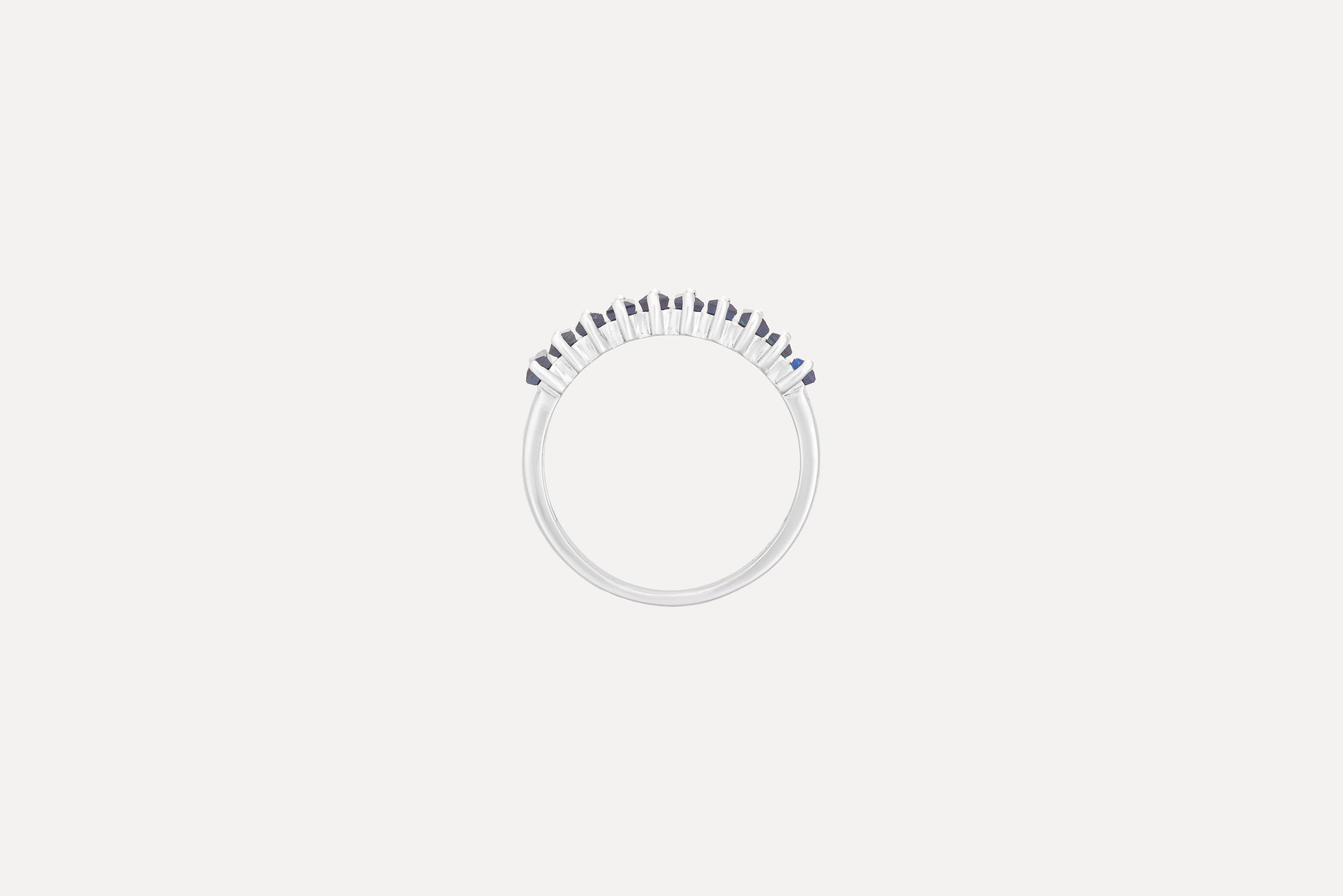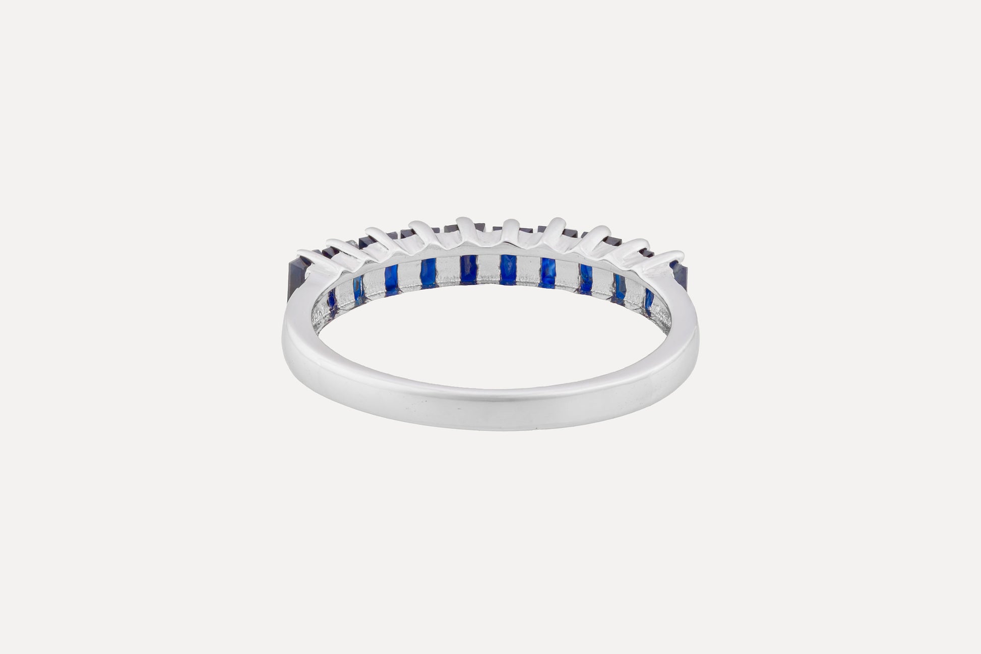 A half circle of blue baguette cut sapphires set onto a sterling silver ring with rhodium plating for a dazzling finish. Creating a simple yet sophisticated and timeless look.
