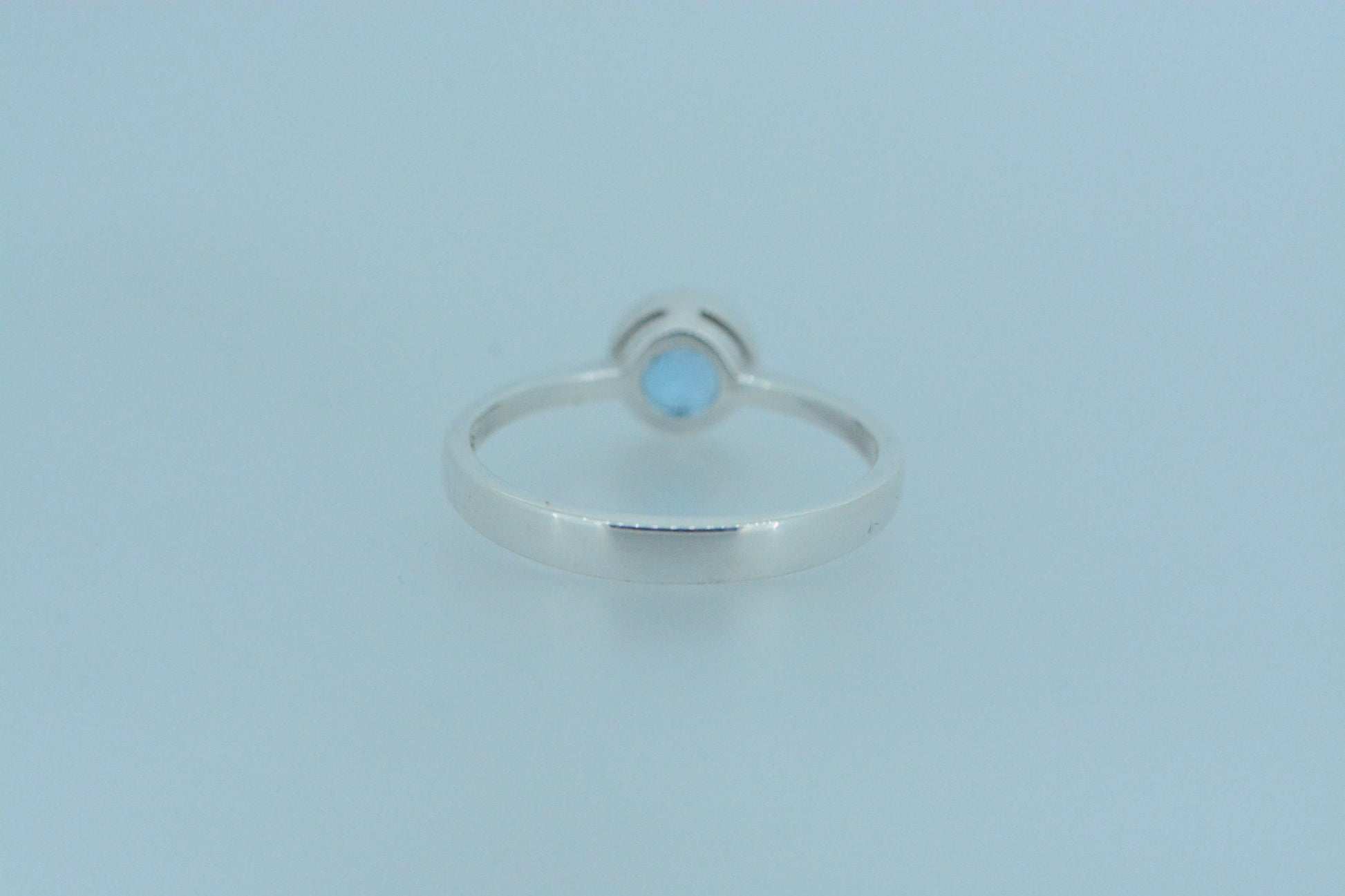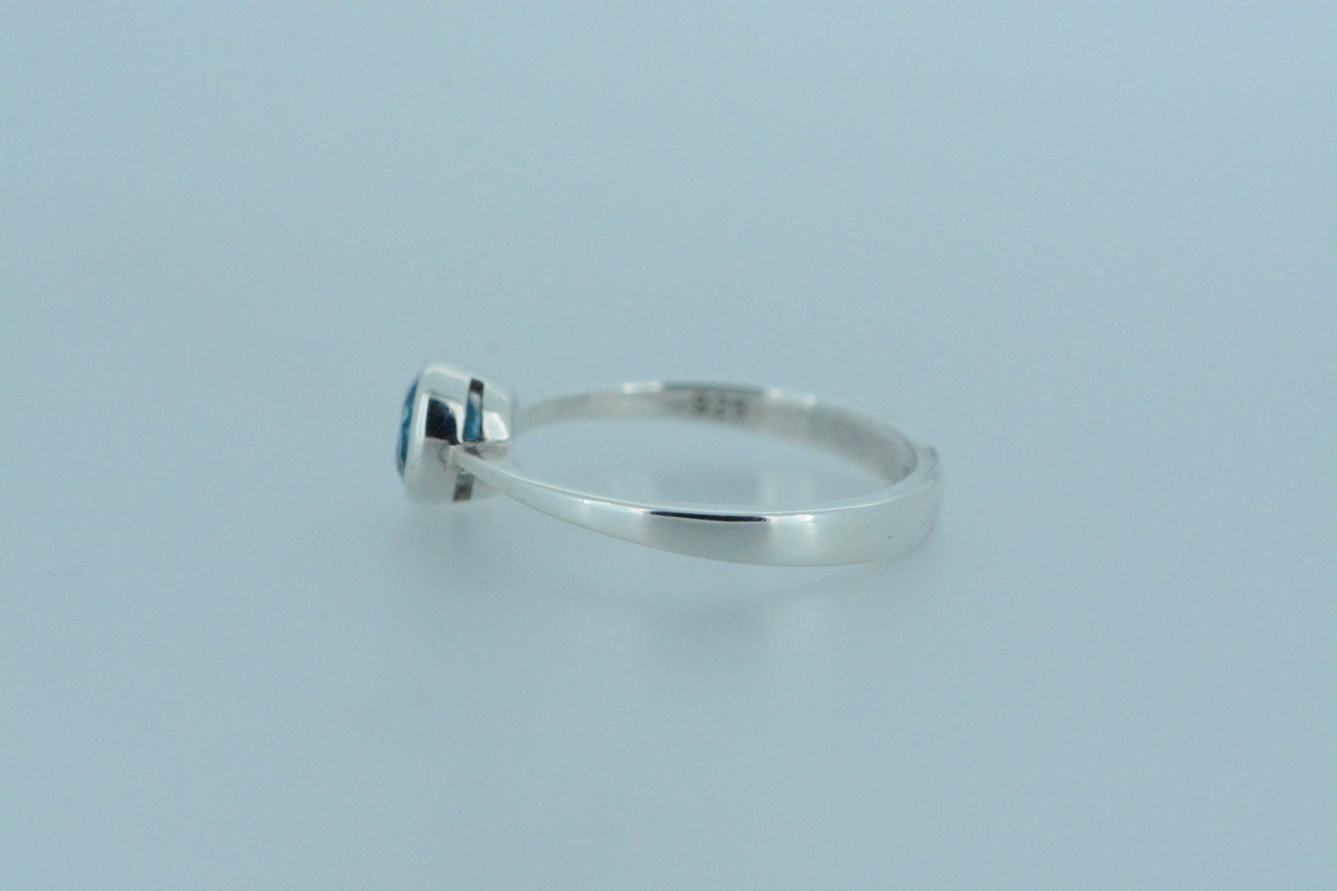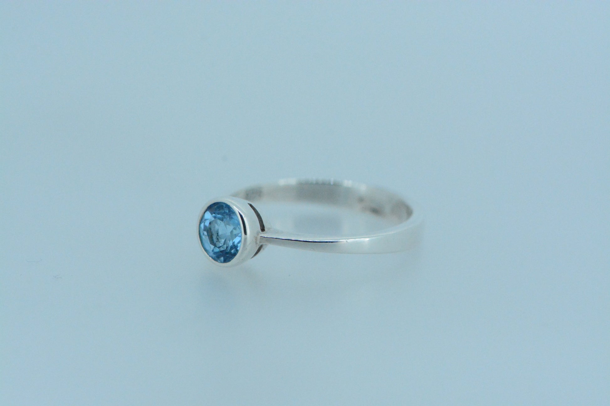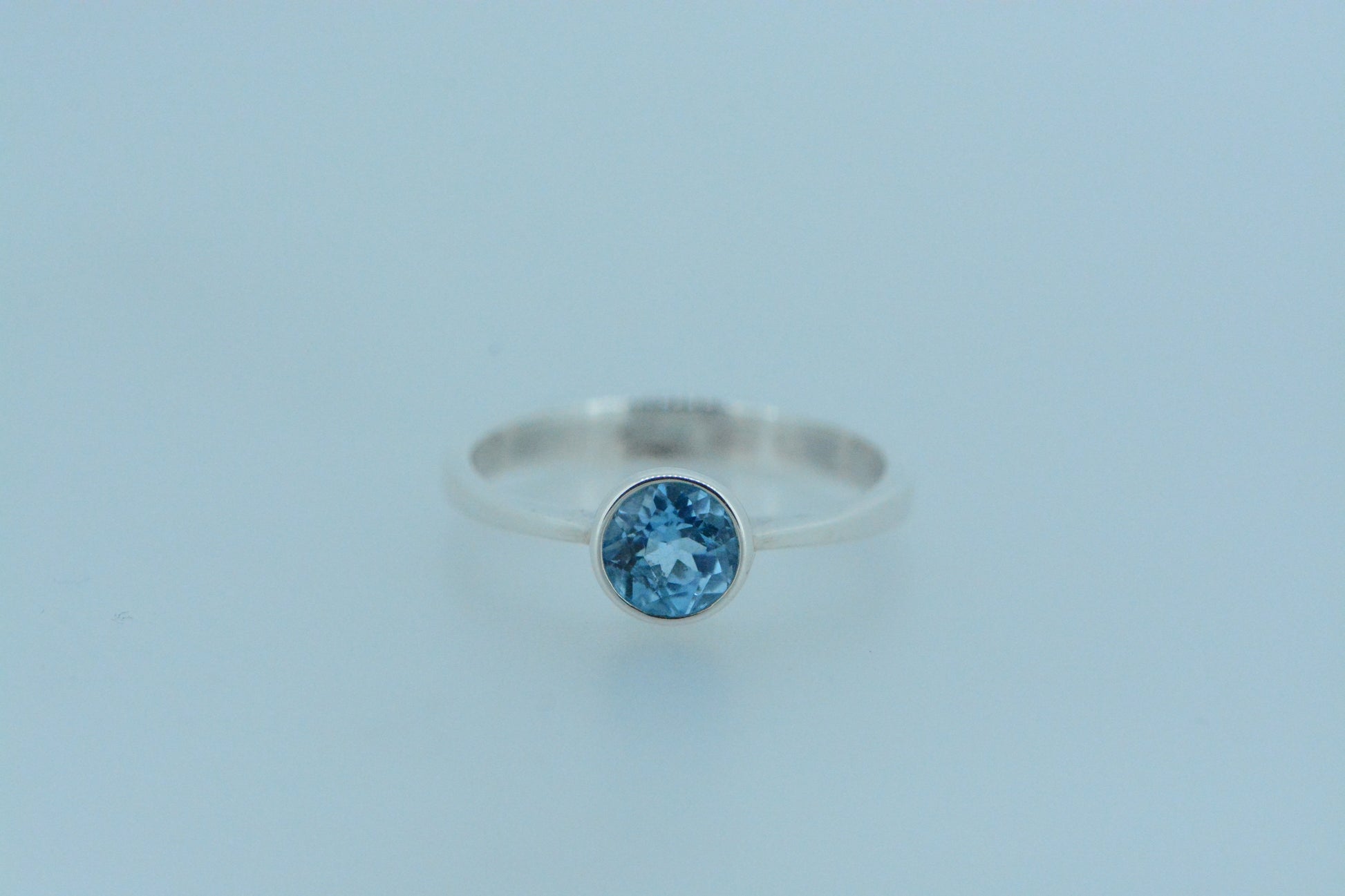 This light bright vibrant blue topaz stone in a round cut in a bezel setting set on a simple sterling silver band ring. An excellent choice with topaz - the birthstone for the month of November.