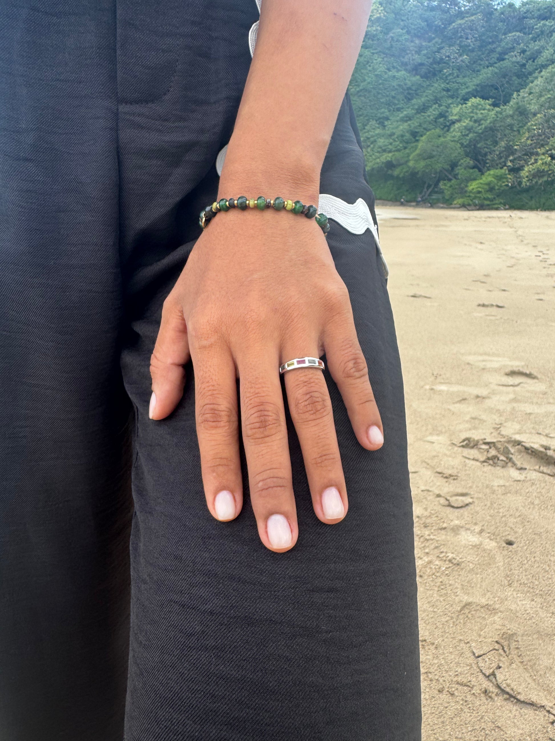 Half circle multi colour baguette cut sapphire eternity band ring set in sterling silver with rhodium plating.