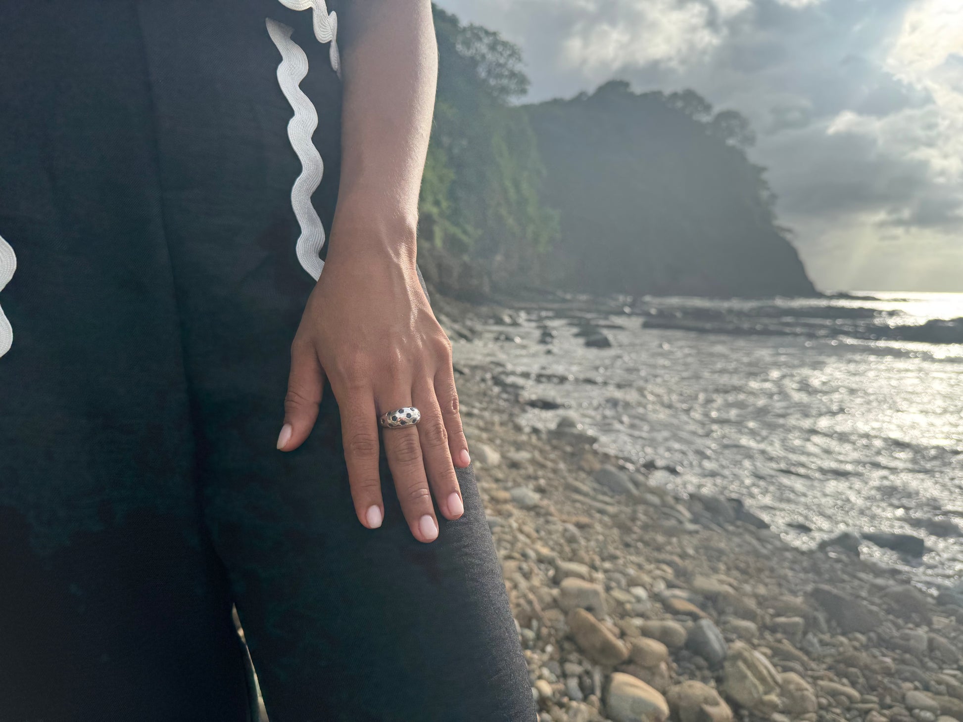 Classic blue sapphires set onto an eye catching dome shaped ring, with rhodium plated sterling silver for a dazzling finish.
