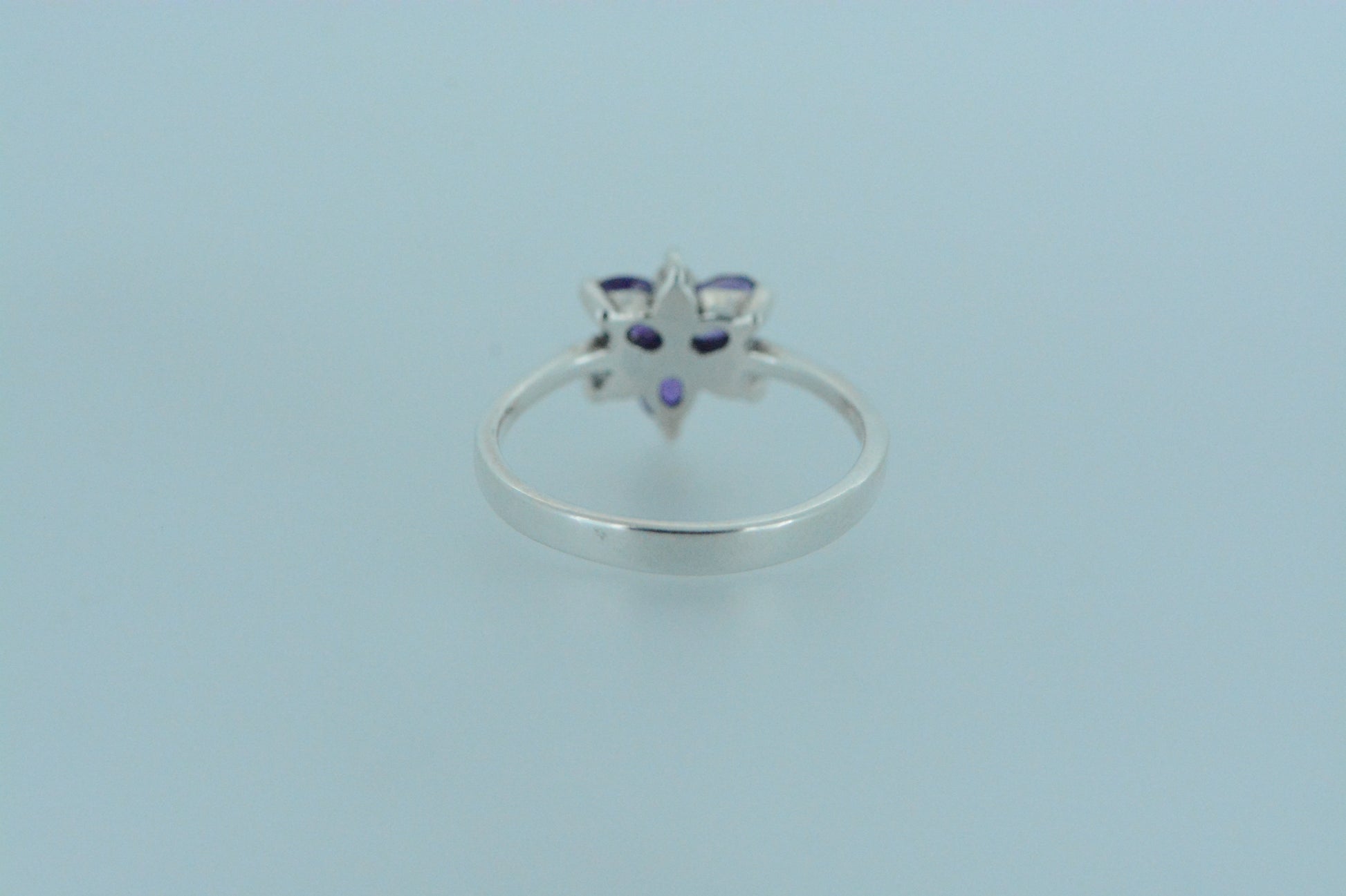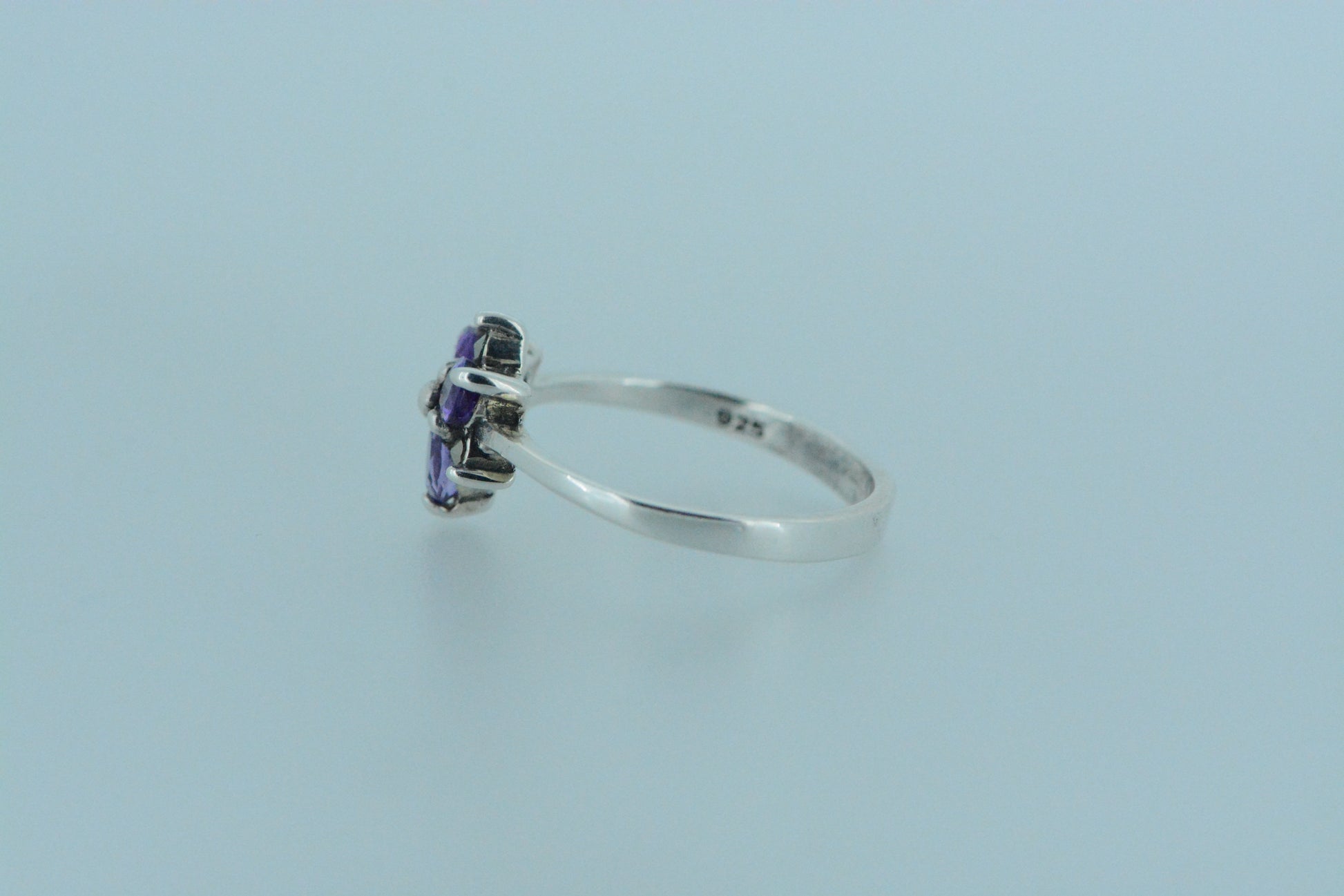 Inspired by nature, this flower ring has three purple amethyst stone petals and three smaller marcasite petals. This dainty ring is both feminine and floral with the birthstone for the month of February.